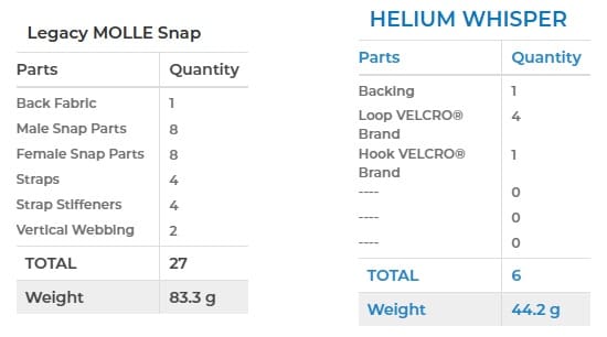 Helium Whisper replaces all of those parts with a single laser-cut piece of proprietary ULTRACOMP high-performance fabric facing laminate. The result is a system built from just 6 parts that cuts the attachment system weight by as much as 50% compared to legacy alternatives. Fewer parts mean fewer opportunities for something to break, corrode, or come apart and the laser precise design eliminates backers that are out of spec. The attachment straps are integral to the backer itself, with no sewn seams to fail or tear away. When a pouch is placed under tension, Helium Whisper tightens its grip rather than pulling apart.