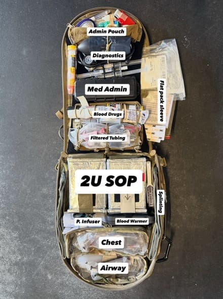 Managing two to three casualties in the real world from a first-line aid bag is not an ultralight solution in the modern age of DCR and Blood Cold Chain. There is an argument to be made that light and fast is an advantage, which is valid, but “heavier” often equals more capable (a Role 2 is more capable than POI, etc). That’s not to say bring the kitchen sink to the POI, just that efficiencies must be incorporated into the first-line bag to adhere to the standard of care, which includes carrying LTOWB (Low-Titer O neg Whole Blood).