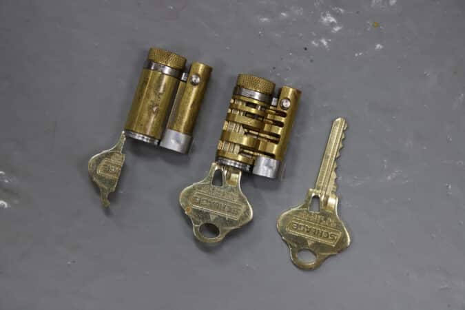 Clear and cutaway locks are very helpful to learn how to pick locks. Inserting the key causes the pins to become aligned.
