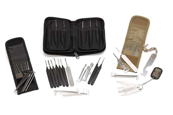 A selection of lockpick sets from Sparrows Lockpicks, from left to right: Tuxedo, Vorax, and EOD Full.