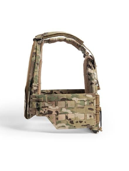 The newly implemented rigidity of the Reactive Cummerbund provides a weight transfer from the shoulders and spine by ensuring the plate bags are kept compressed against the body, without compromising the same level of comfort as an elastic cummerbund. The mounting location of the cummerbund ensures that armor plates are positioned correctly on the body, while maintaining a level cummerbund. The added rigidity also allows for heavier items to be mounted on either side of the polypropylene composite (CURV) chassis. A one-size-fits most sizeable structure, combined with a tension-adjusting shock cord system in the rear accommodates natural flexion and expansion of the body and allows for a streamlined acquisition process since there is only one size.