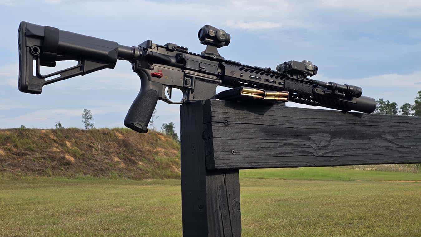 The lower receiver was unchanged from its usual configuration for my 10.5″ suppressed 5.56 upper, including an H2 buffer, standard carbine spring, and Geissele SD-E trigger.