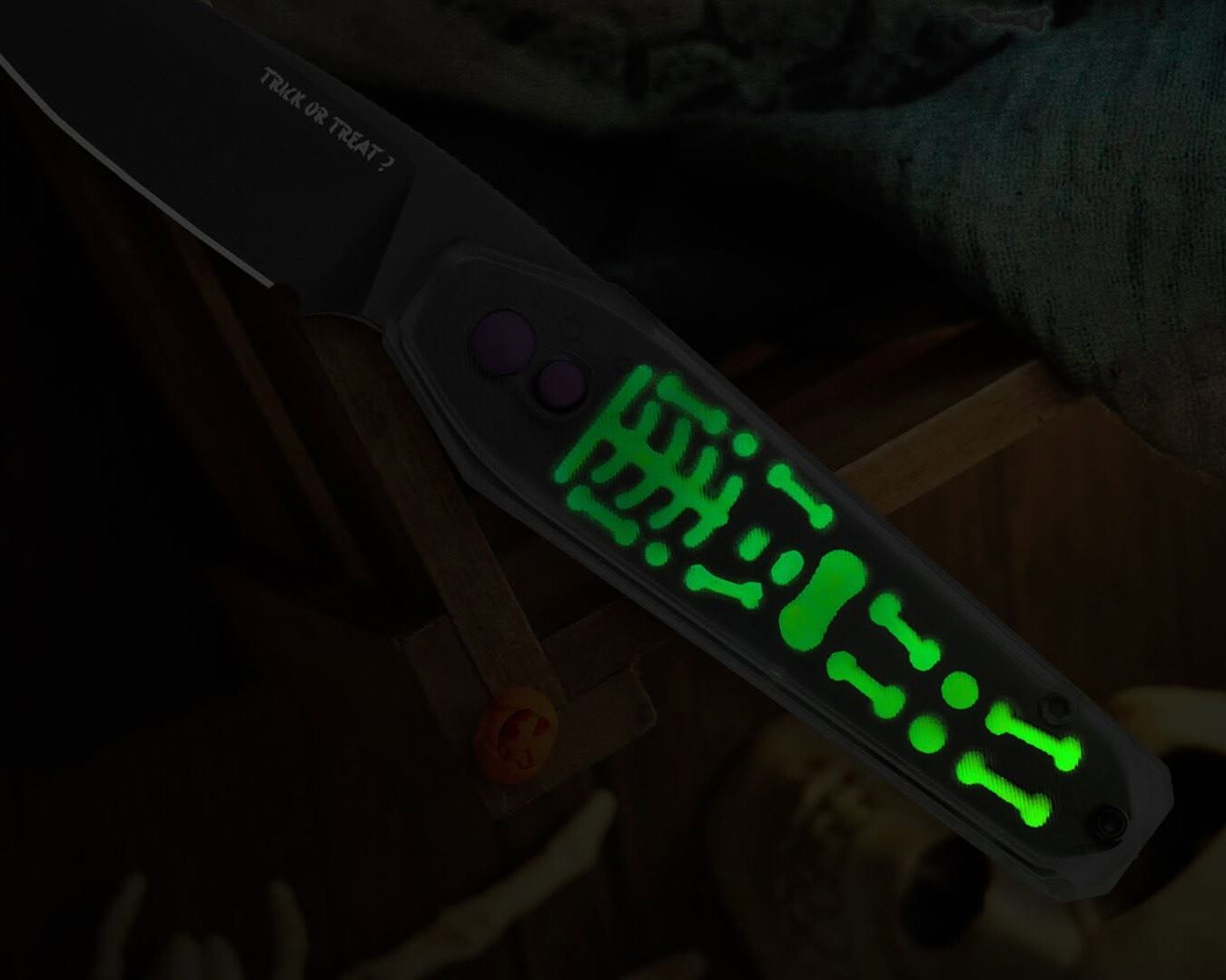 Continuing with the osseus theme, this version of the dirk-like tactical fixed blade has handle and blade bedizened with bone-themed flourishes. All of the Halloween folding knives have the eternal phrase “Trick or Treat?” graven on them; the Hidden Agenda, instead, puts these powerful words on its sheath.