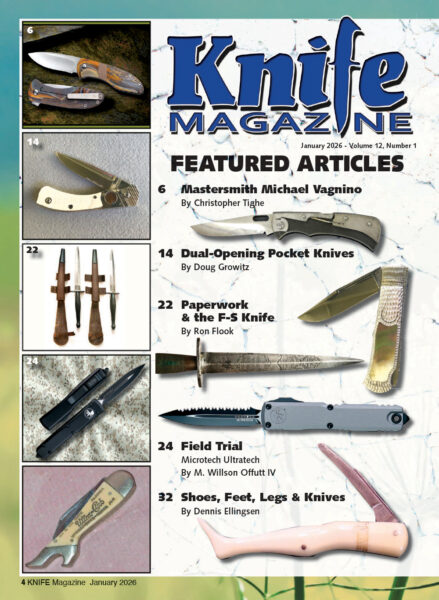 For this month’s cover article, Chris Tighe profiles ABS Mastersmith Michael Vagnino. Willson Offutt reviews the Microtech Ultratech, which is quite a departure from his typical knife of choice. Dennis Ellingsen gives an in-depth history of the ubiquitous “Leg Knife”. Ron Flook dives deep into Fairbairn paperwork, and Doug Growitz tells the story of dual-open pocket knives.